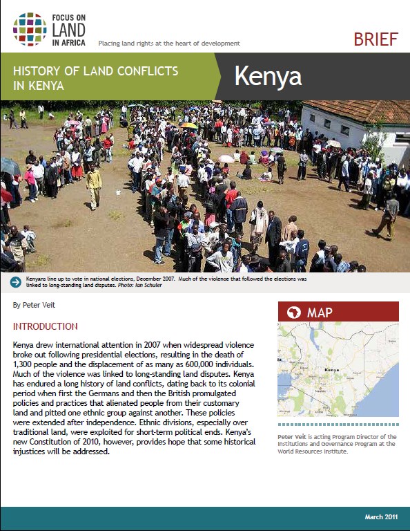 Kenya drew international attention in 2007 when widespread violencebroke out following presidential elections, resulting in the death of1,300 people and the displacement of as many as 600,000 individuals.Much of the violence was linked to long-standing land disputes. Kenyahas endured a long history of land conflicts, dating back to its colonialperiod when first the Germans and then the British promulgatedpolicies and practices that alienated people from their customaryland and pitted one ethnic group against another. These policieswere extended after independence. Ethnic divisions, especially overtraditional land, were exploited for short-term political ends. Kenya’snew Constitution of 2010, however, provides hope that some historicalinjustices will be addressed.